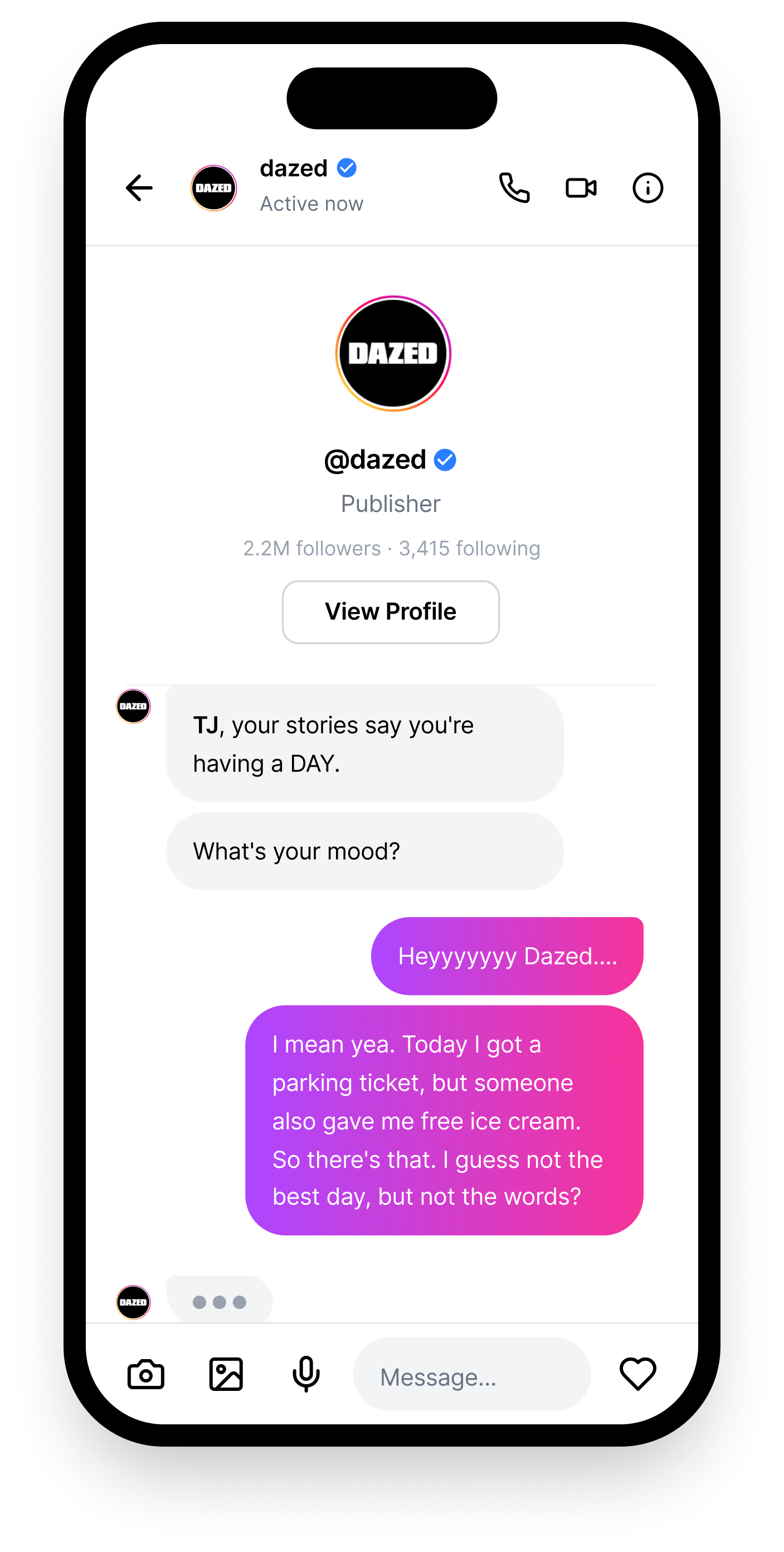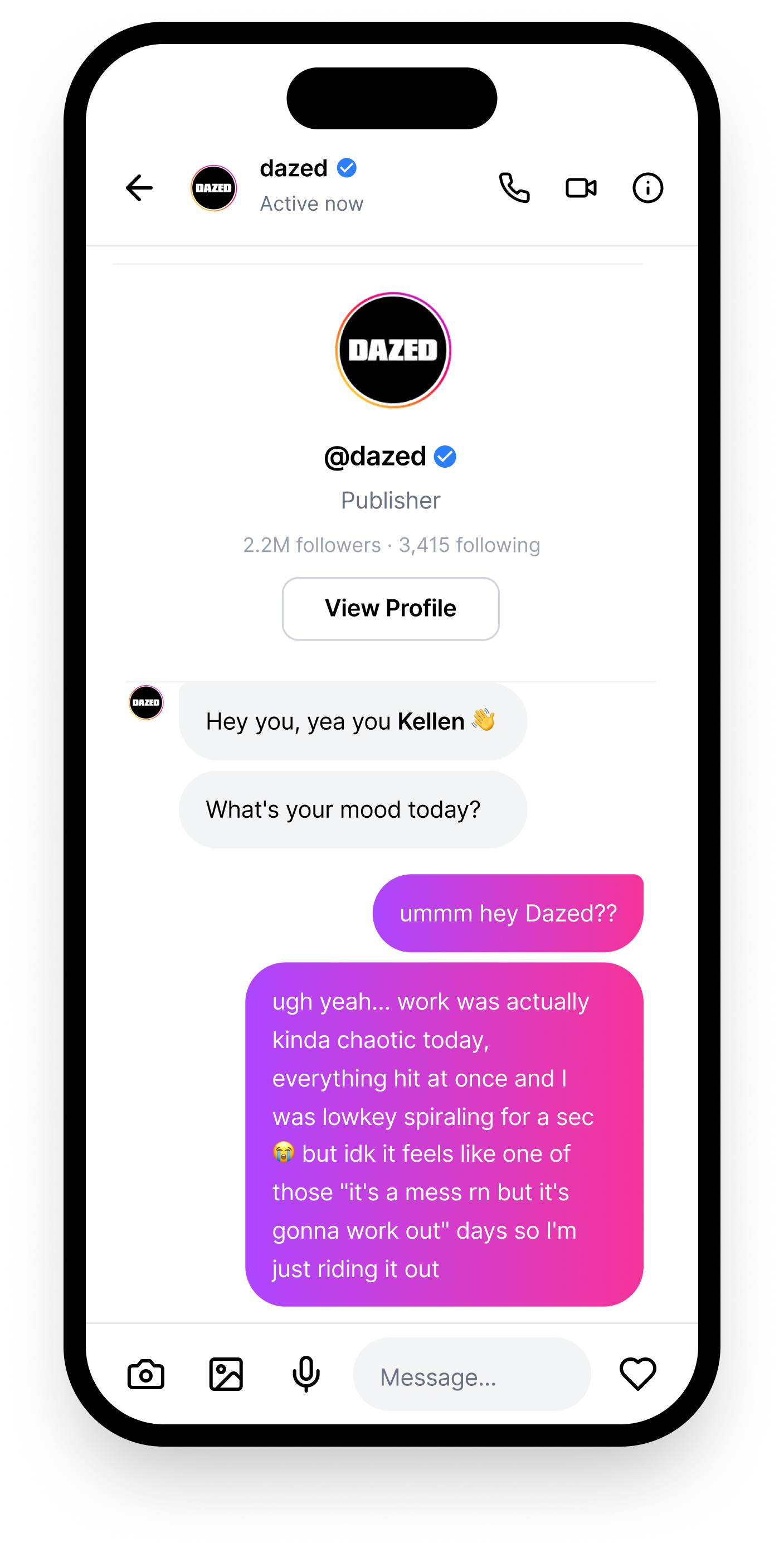 What starts as a message turns into a real conversation with someone from the Dazed team about your day, your mood, and what’s on your mind. Along the way, users discover a new connection and are invited to explore Dazed Frequency in the app - a feature designed to meet them exactly where they are emotionally.