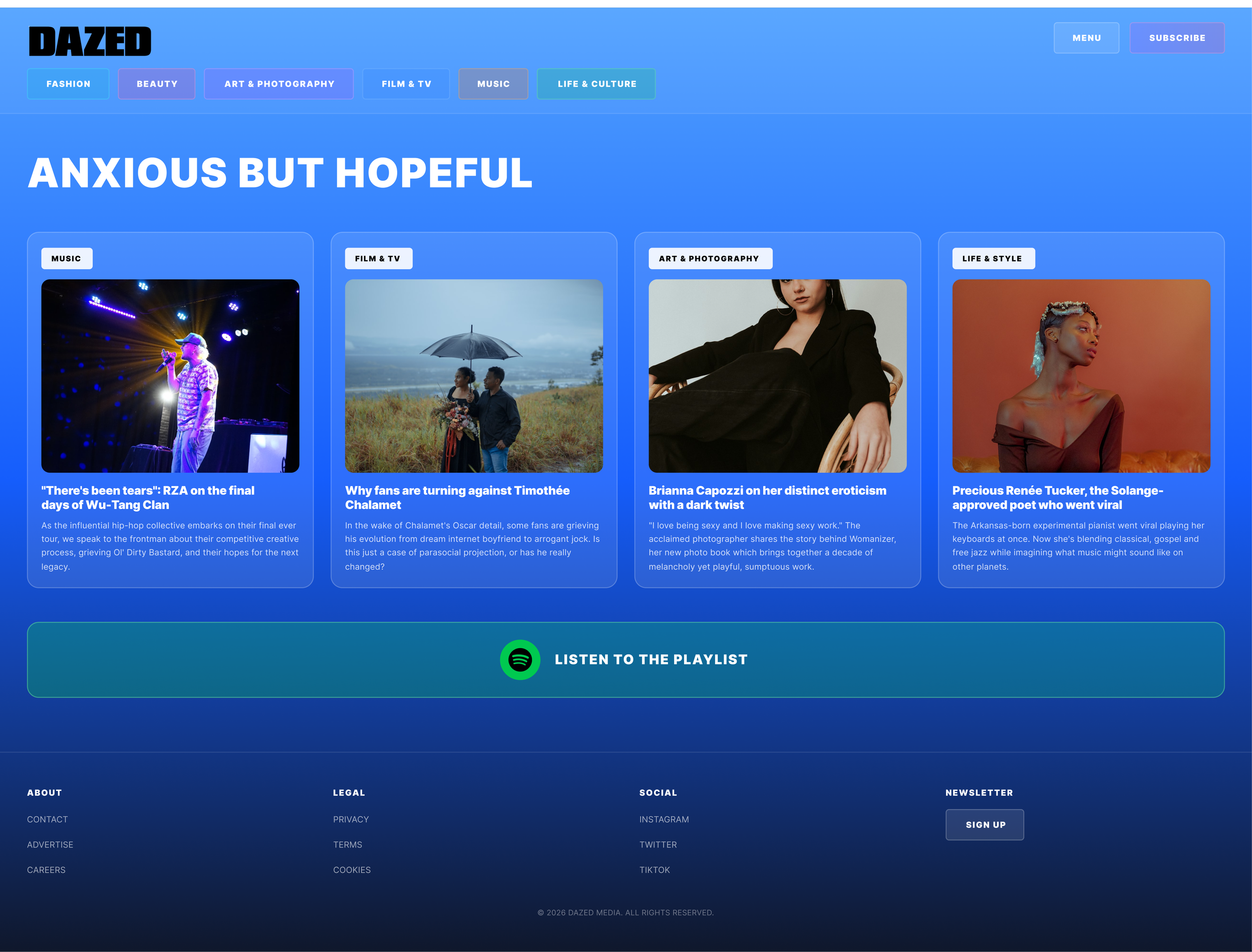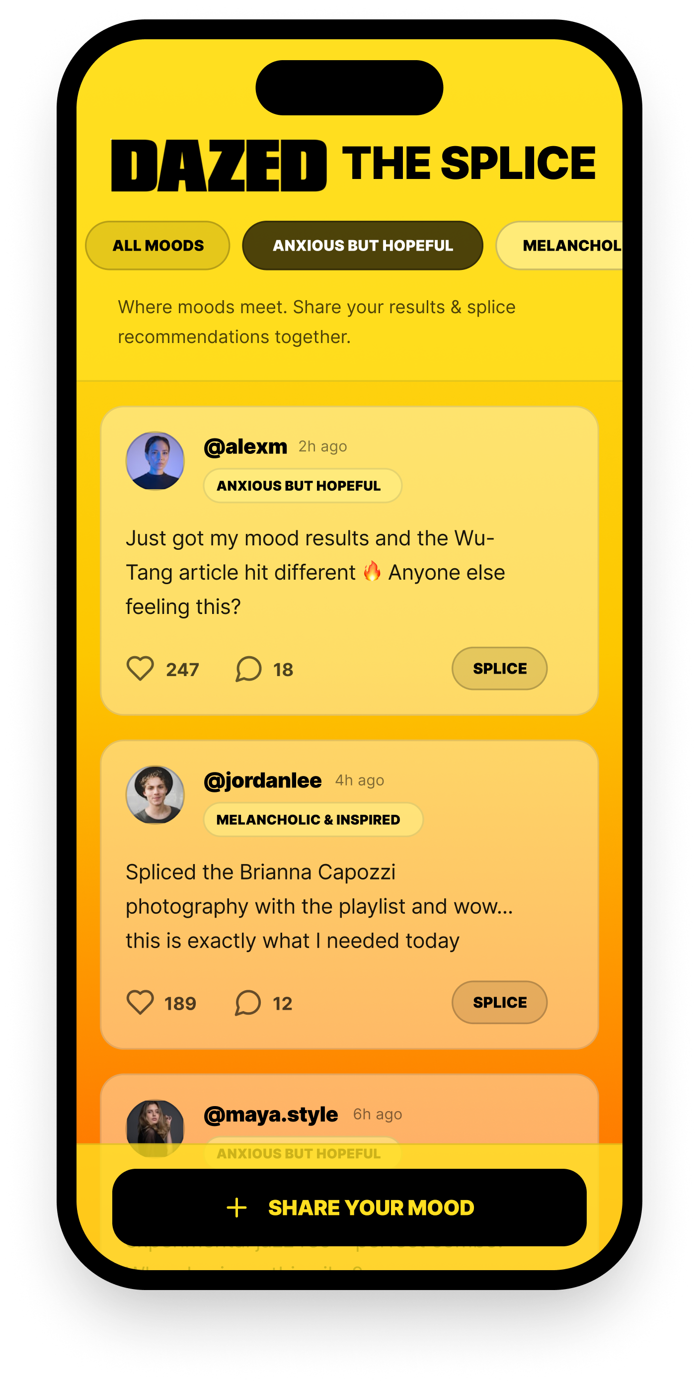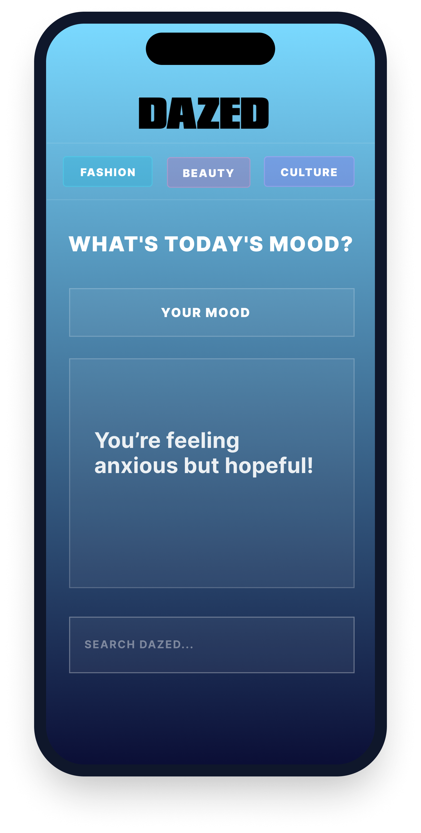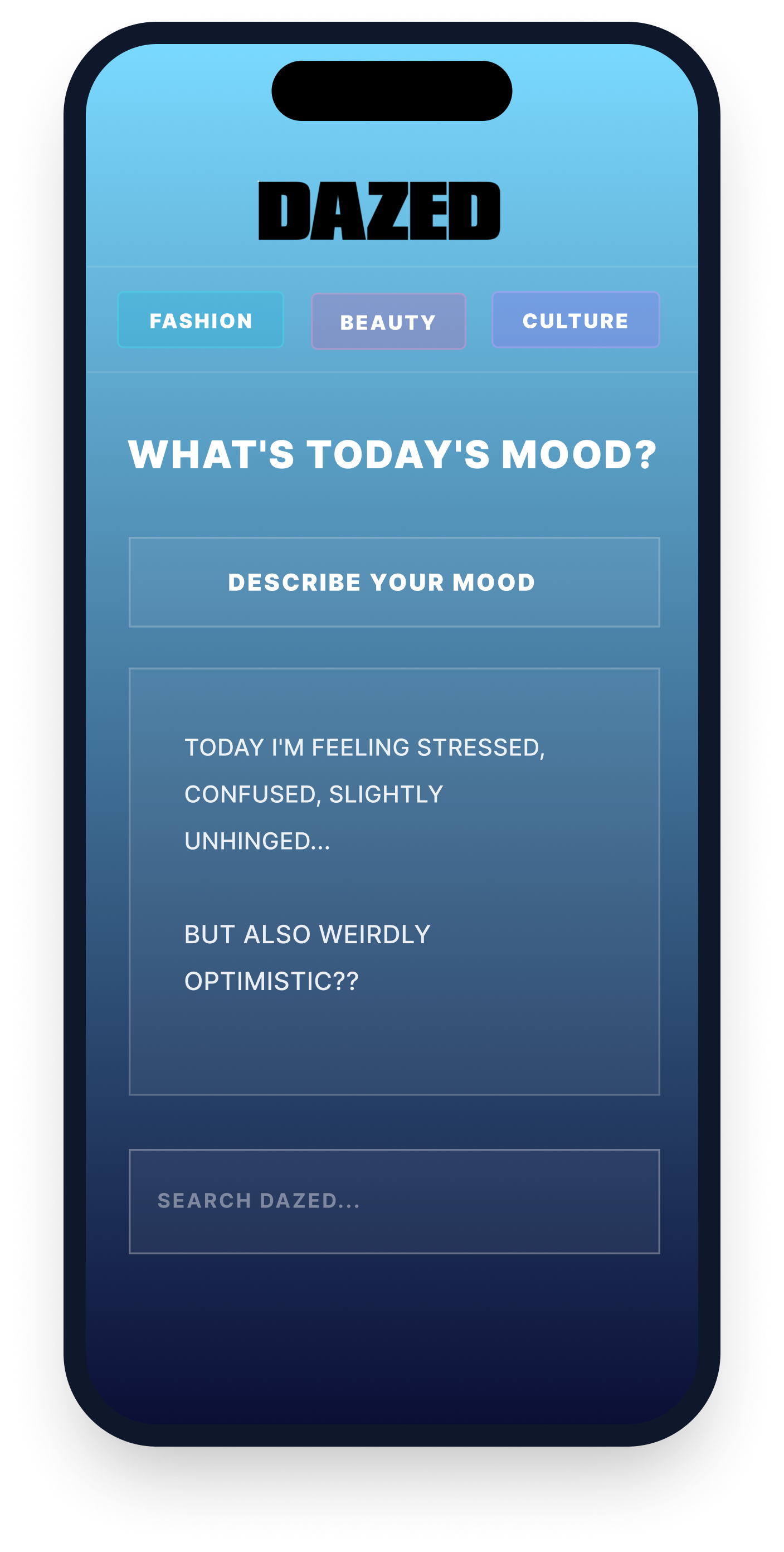 Dazed Frequency turns passive scrolling into something that actually sees you. It's mood-based media at scale, and according to the manifesto, it's long overdue.
