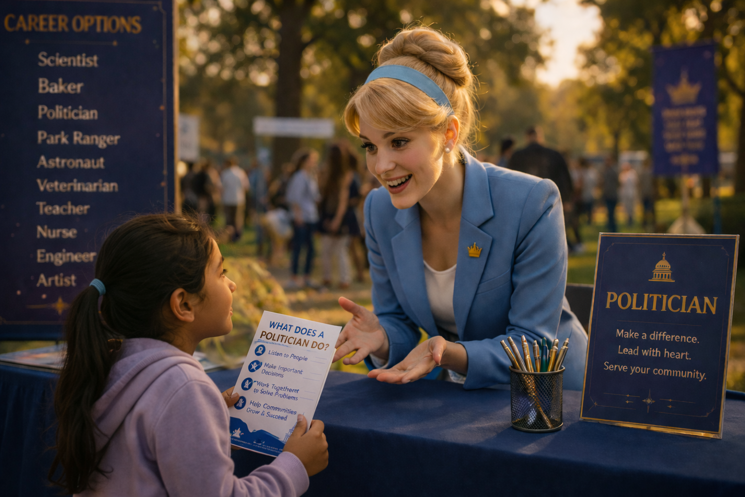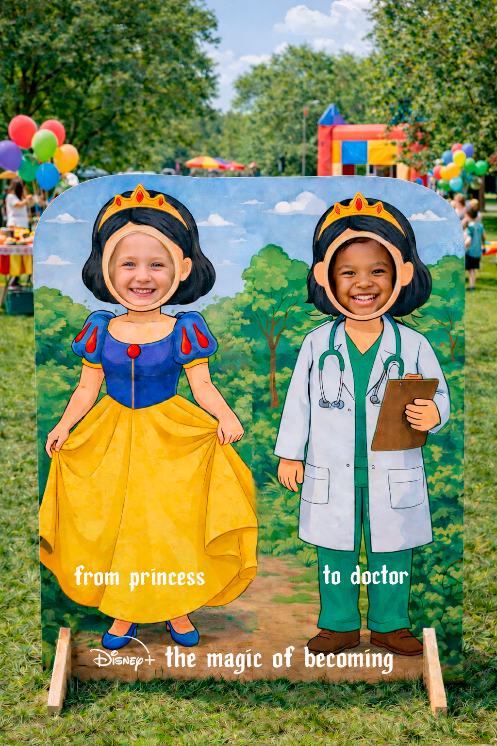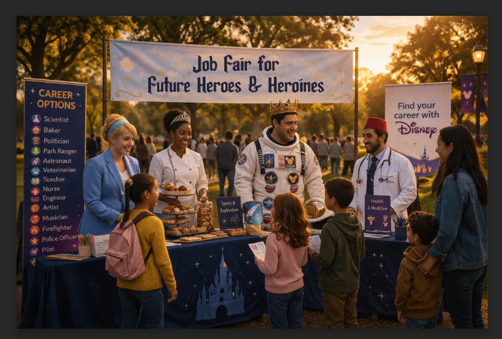 At the Disney + Kids Job Fair, children can step into the future alongside their favorite princes and princesses through interactive photo cutouts and imaginative role-play.